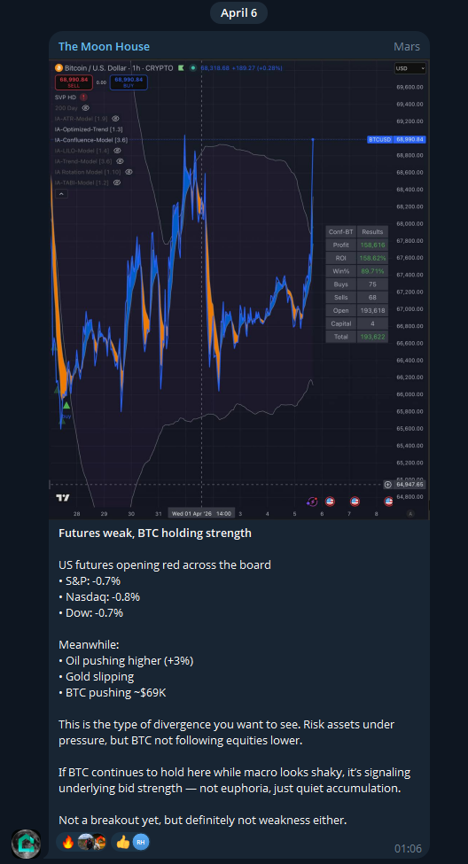 US equity futures opened lower while oil prices moved higher, yet Bitcoin continued climbing toward the 69,000 level. This divergence suggests that Bitcoin may be experiencing quiet accumulation even as traditional risk assets face pressure. The move appears driven by underlying demand rather than speculative momentum.